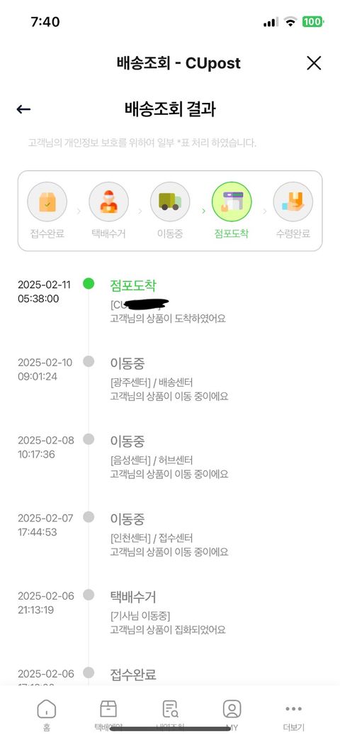 2/6에 구매자에게 상품을 cu 편의점 택배로 보냈고, 운송장 조회를 통해 2/11에 구매자의 편의점에 도착했다는 사실을 알았습니다.