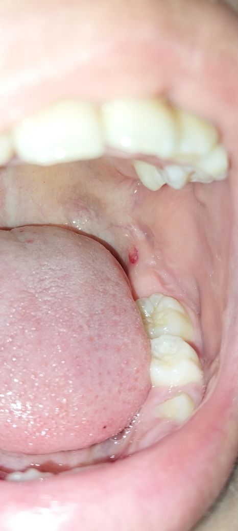 사진으로 봤을 때는 점액종으로 보입니다. 점액종은 점막 조직이라고 과연 자극을 받았을 때 점액 내부에 조직 액이 차면서 생기게 됩니다. 그게 문제가 되는 것은 아니며간단히 제거할 수도 있습니다. 자세한 확인을 위해서 치과에서 진료를 받아보는 것을 권해드립니다.