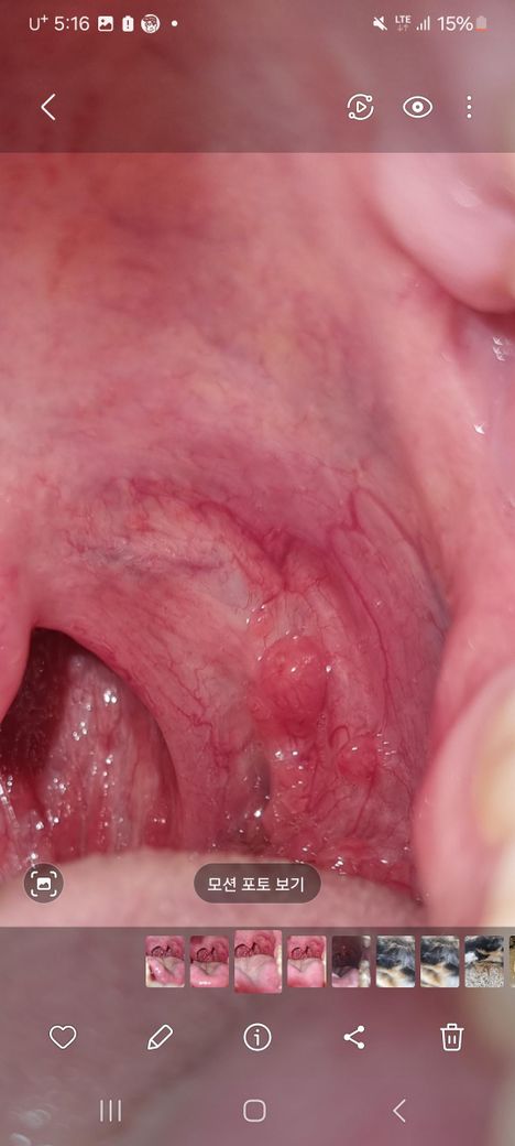 사진을 보니 목구멍에 붉은 염증과 함께 물집이나 부어오른 부분이 보입니다. 이러한 증상은 인후염, 편도선염, 또는 기타 감염성 질환의 징후일 수 있습니다. 심한 통증은 아니지만 침을 삼킬 때 약간의 이물감과 가끔 쉰 목소리가 나타난다면 이는 인후염일 가능성이 있습니다. 인후염은 바이러스나 세균 감염으로 인해 발생하며, 흔히 감기나 독감과 연관되어 나타날 수 있습니다.