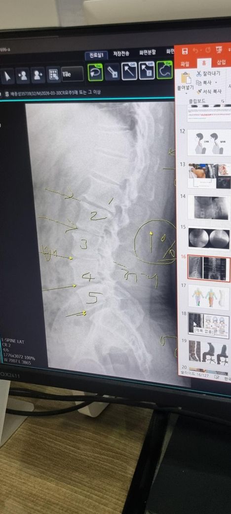 사진만으론 판단을 하긴 어렵지만 허리 커브의 감소와 뼈와 뼈 사이의 디스크 공간이 다소 좁기에 디스크를 의심해볼 수 있습니다.