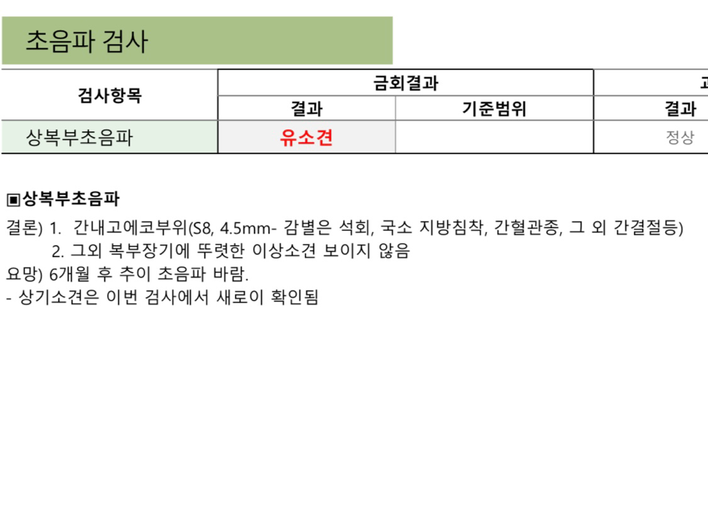 안녕하세요. 이욱현 의사입니다. 간에 초음파에서 하얗게 보이는 부분이 있다는 뜻입니다. 유소견이라는 것은 해당 소견이 있다는 뜻입니다. 결과지에는 6개월 뒤에 다시 검사해보라고 되어 있습니다. 추가로 진료를 보거나 치료가 필요하다는 언급은 없습니다.