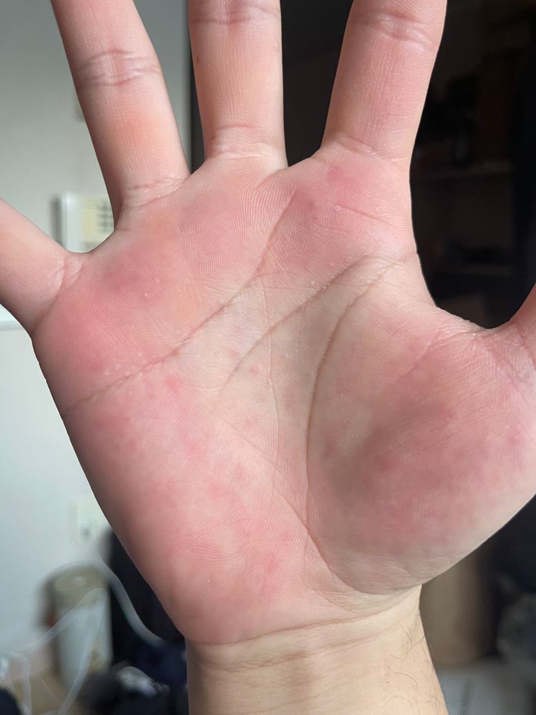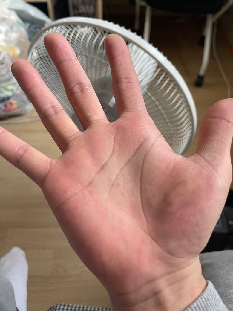 사진에서 보이는 것처럼 좁쌀 같은 염증 같응것이 손바닥에 생겼어요. 직접적인 통증은 없으나, 물체를 만질때 해당 부분에서 저린 느낌이 들어요. 추가적으로 흰색의 작은 동그라미 각질도 생겼어요