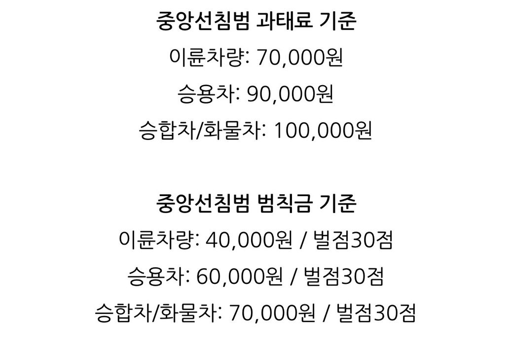 중앙선 침범으로 현장에서 단속이 되면 해당 교통 법규 위반 운전자에게 범칙금 및 벌점이 주어집니다.