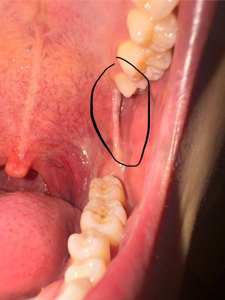 사진상으로 봤을때 익돌하악봉선부위 궤양성 염증의 양상이 있습니다. 그래서 입을 벌릴때 자극이 되어 통증이 유발될 수 있고요. 구강내과에서 정확한 검진을 받아보시기 바랍니다.