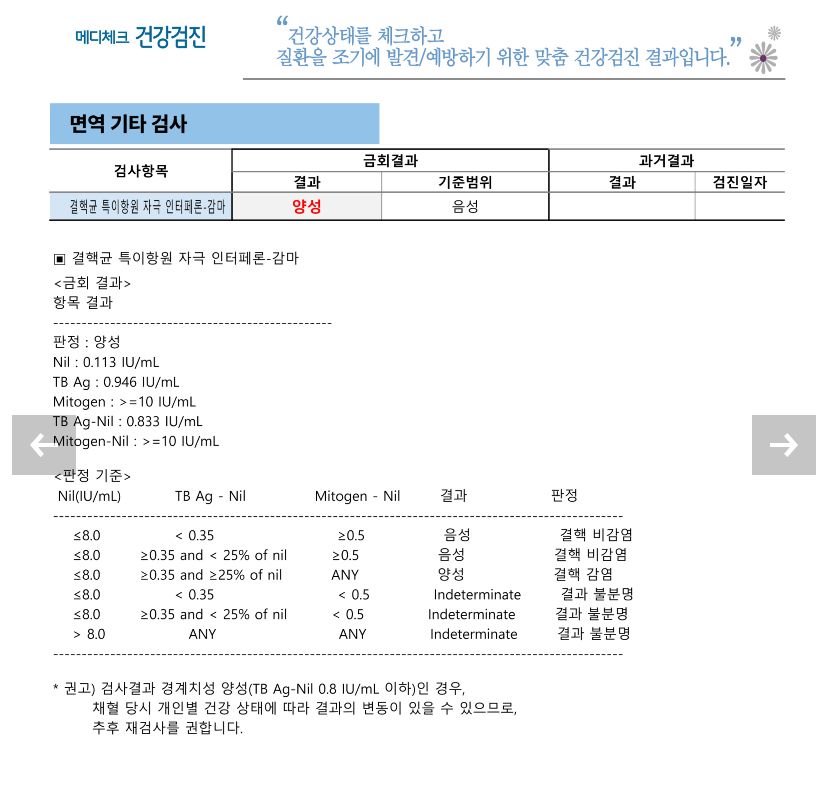 취업 때문에 잠복결핵 검사를 받았는데 저렇게 양성이 나왔어요 저는 결핵에 걸린적도 기침가래 증상도 없는데 결과가 왜 이런가요? 한 항목만 양성으로 나오고 나머지는 다 음성에 정상 결과 인데 잠복결핵이 맞는건가요?아님 재검을 해야하나요??