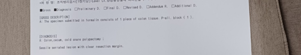 위의 사진은 조직검사를 시행했고 경계를 깨끗하게 도려냈다는 말만 써있습니다. 조직검사 결과는 병리검사 결과를 통해 알 수 있습니다.