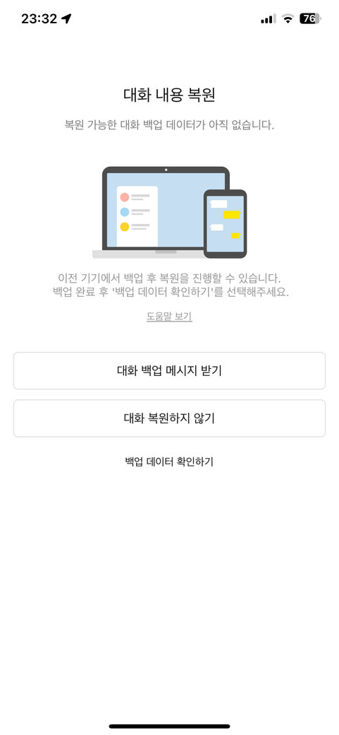복원하기를 꼭 누르셔야 이전 대화들이 백업되어 모두 불러들일 수 있습니다.