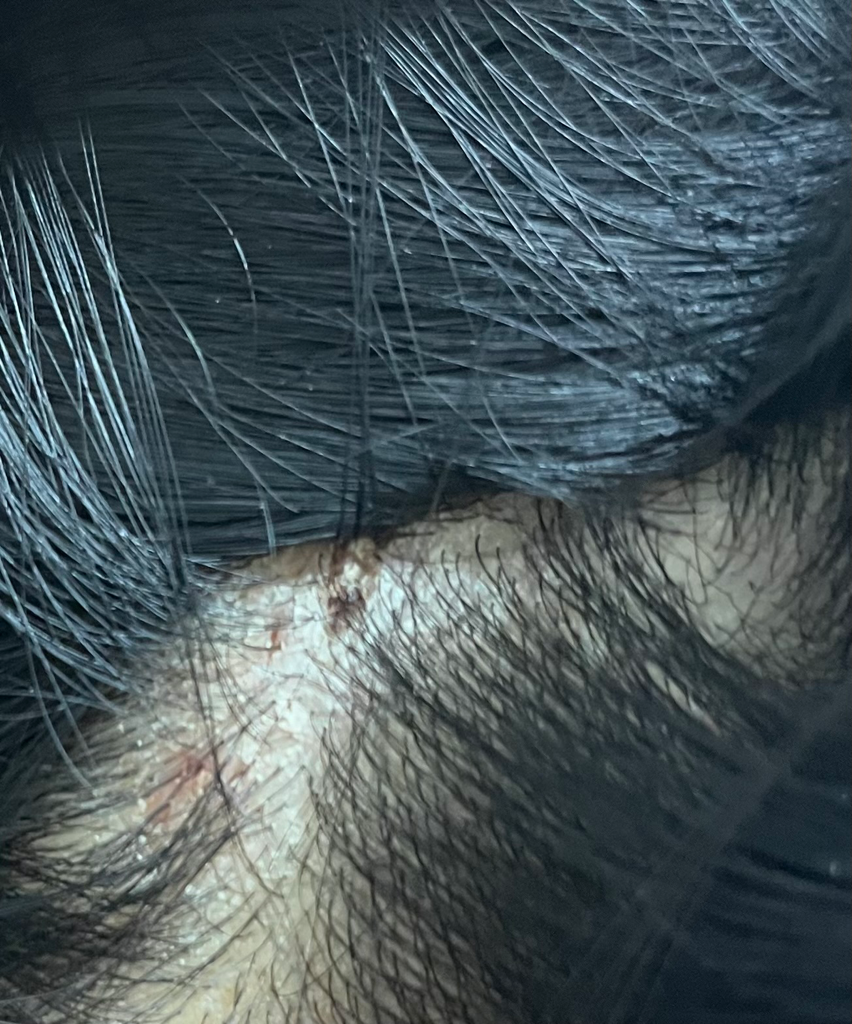 검은색은 점입니다. 아랫쪽에 빨간색이 보이는데 지루성 두피염이 같이 있는것 같고 이것 때문에 통증이 있을수는 있겠습니다.