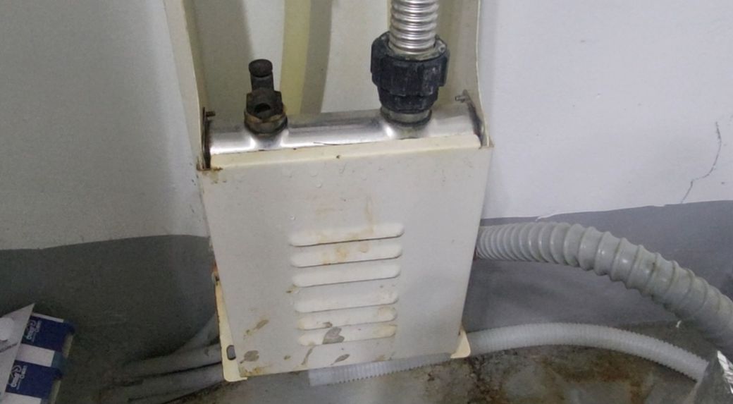 보일러실 바닥에 물이 조금 고여 확인하니 사진 속 보일러 장치에 물방울들이 있었고 이외로는 물이 샌 흔적은 없습니다.