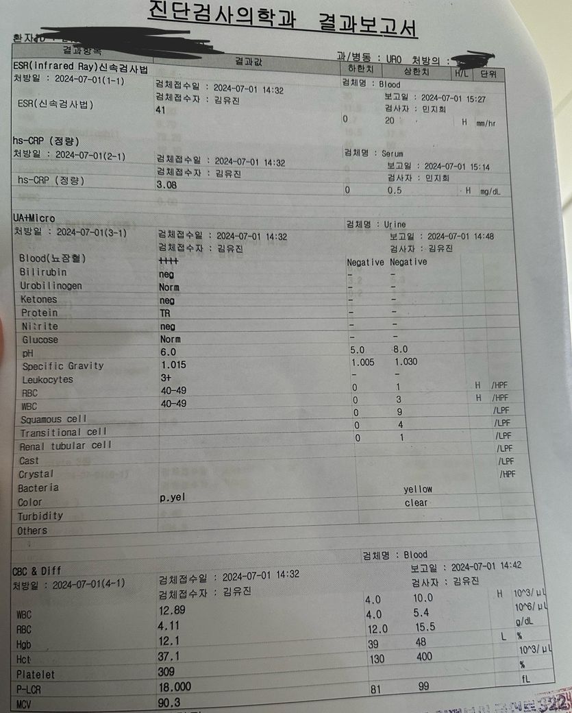 올려주신 검사 결과지로 미루어 염증 수치가 증가 되어 있고 소변검사에서 혈뇨와 세균뇨가 있어 요로감염, 신우신염의 가능성이 생각됩니다.