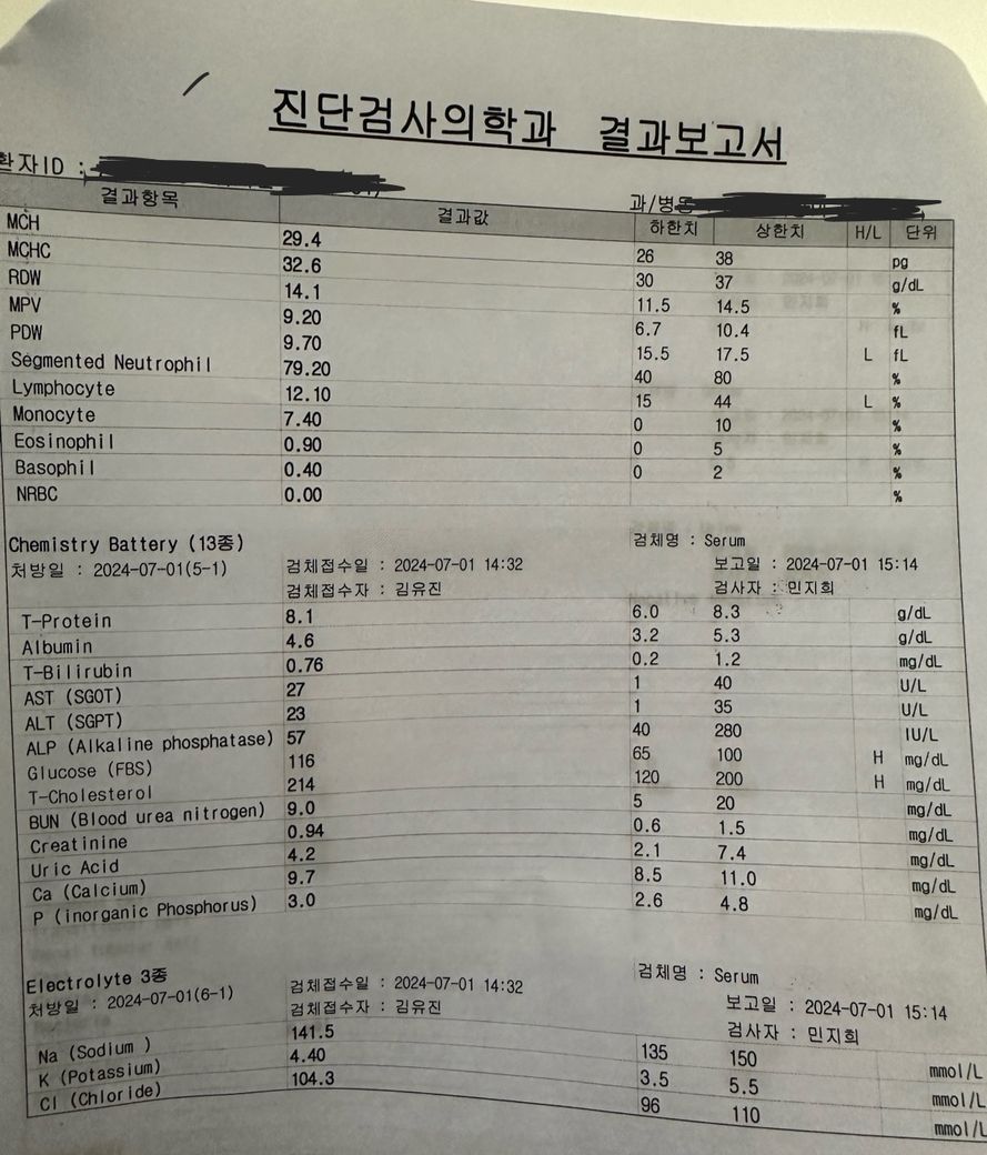 결론적으로는 공복혈당이 높고 체내 염증수치가 올라가 있는 상태로 감염, 염증이 있는 상태라고 볼수 있습니다.