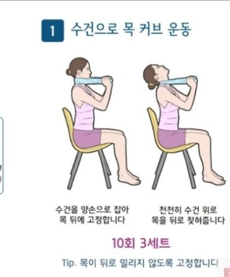 턱 당기기(Chin tuck), 흉곽 열기, 견갑 하강 스트레칭을 매일 5~10분 해주세요.