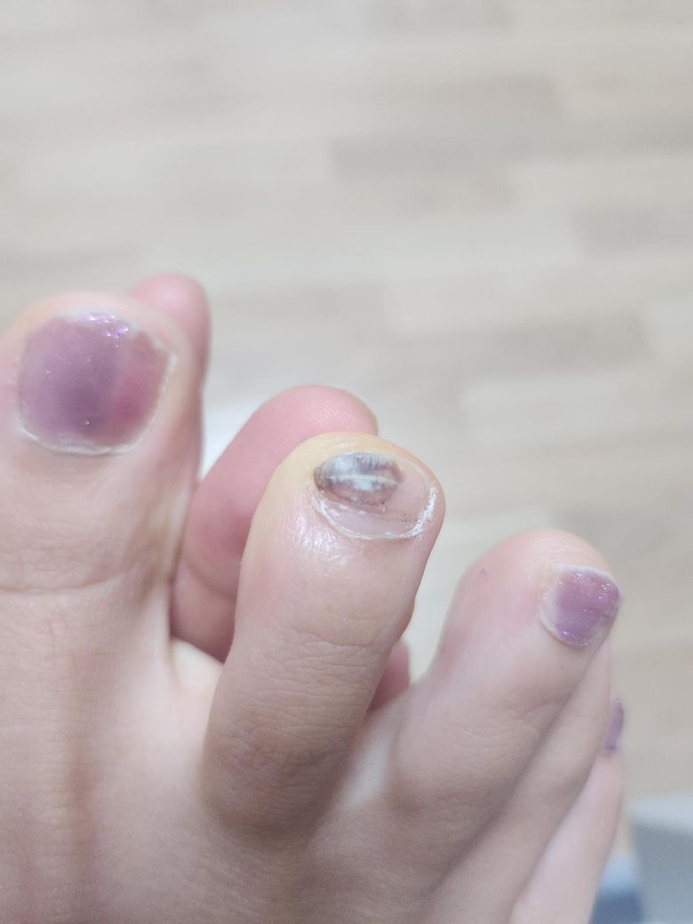 이렇게 발톱이 멍이들었는데 어떻게해야 없어질까요? 뽑아야되나 손톱깍이로 멍든부분만 깍아야될까요?ㅠㅠ...가르쳐주세요!~