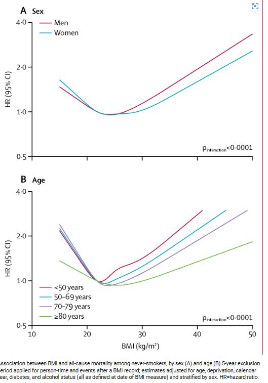BMI가 20 중반 정도 보다 작게 되면 작을수록 사망률이 증가하며 이는 젋을수록 심한것을