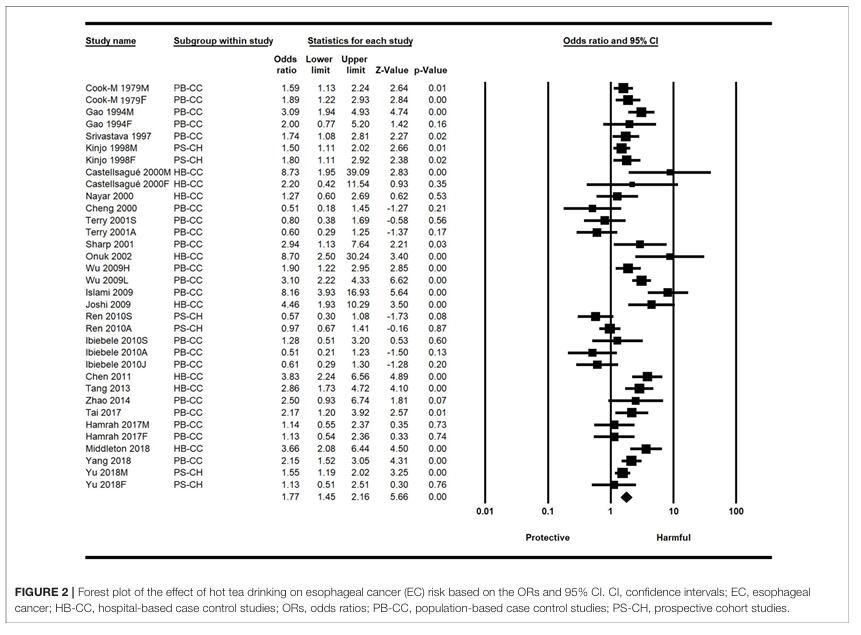 Hot Tea Consumption and Esophageal Cancer Risk: A Meta-Analysis of Observational Studies (Front. Nutr. 9:831567.) A statistically significant increased EC risk was observed when drinking tea at higher temperature (odds ratios (ORs) = 1.79, 95% CI: 1.48–2.15, p =0.00).