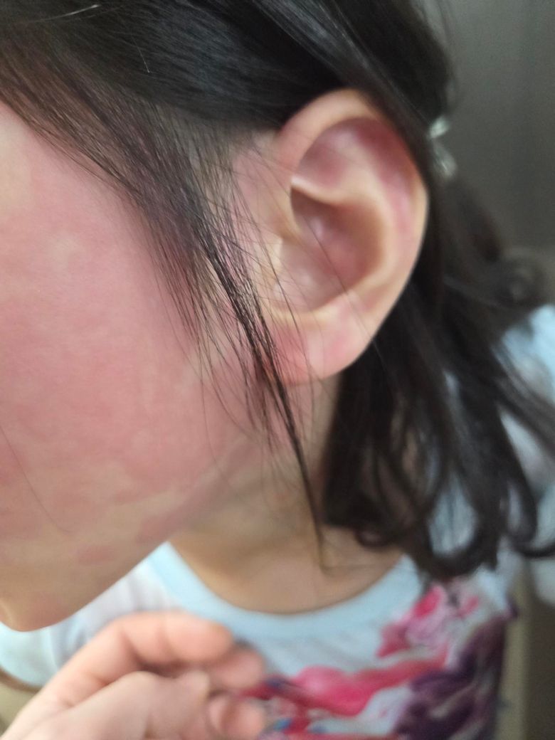 사진과 병력 종합하면 급성 두드러기, 특히 바이러스 연관 두드러기 가능성이 가장 높습니다.