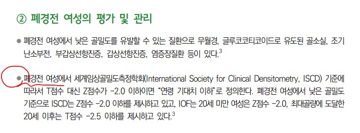 폐경전여성에서는 Z점수를 확인합니다. '정상' 혹은 '연령기대치이하' 로 구분합니다.