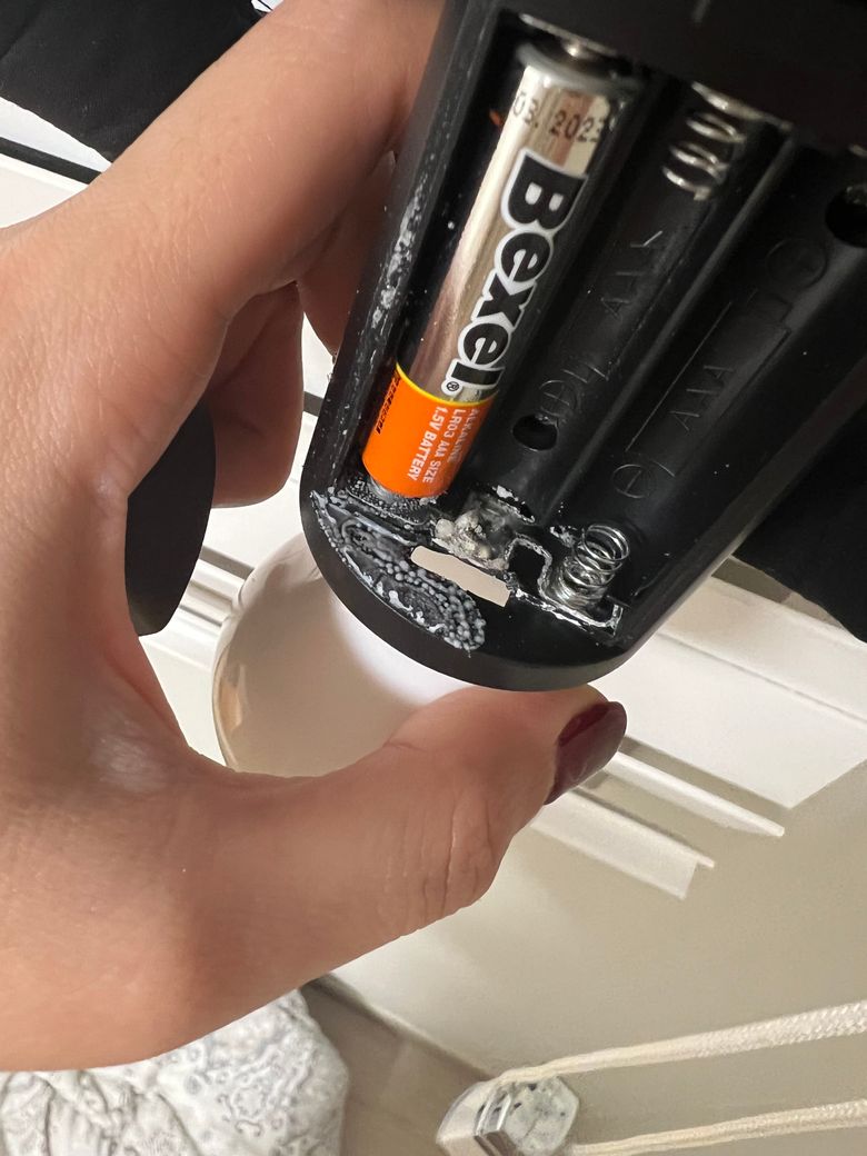 오래된 건전지에 자주 발생하는걸 볼수있는데요 흰색 가루는 배터리 전해액이 증발하면서 나타난 화학물입니다.
