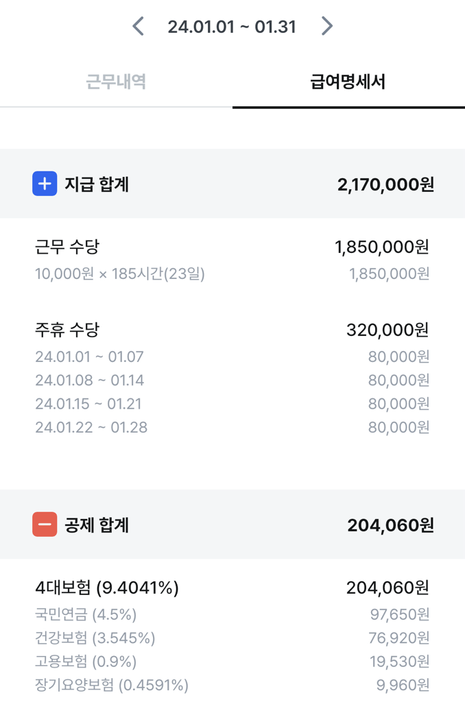 세전 2,170,000원이라면 국민연금 (4.5%)97,650원 건강보험 (3.545%)76,920원 요양보험 (12.95%)9,960원
