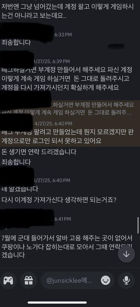 계정주인은 환불해주고 다시 회수해서 사용한다고 하였으나 마음이 바뀌어 다시는 안들어오겠다고 연락이옴