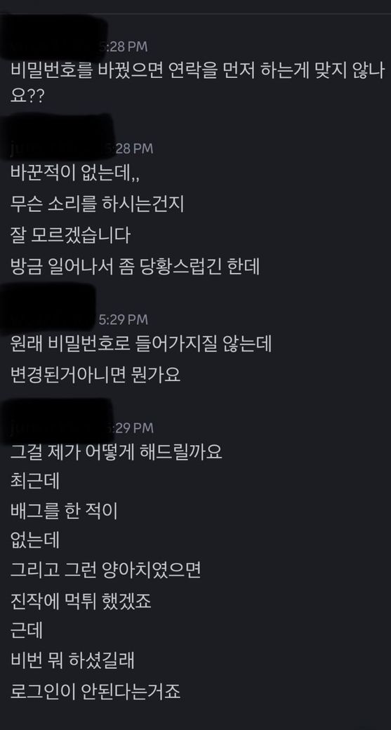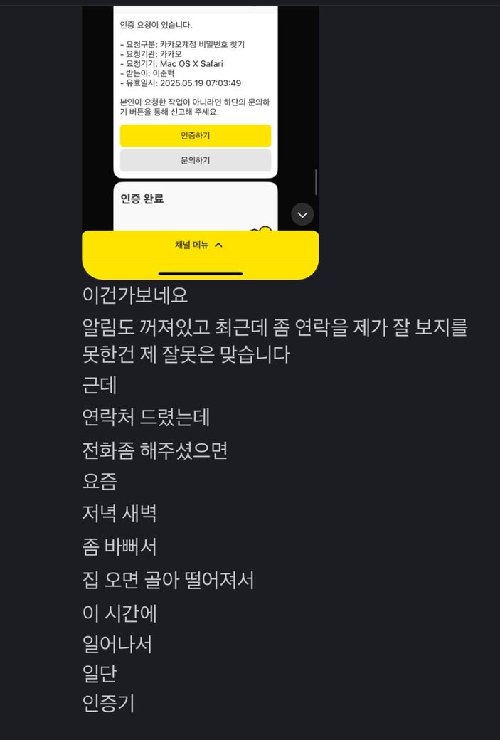 접속이 안된다고 비밀번호 변경했냐고 물어보니 자기는 아니라고 하지만 카톡내역 5월19일경 비밀번호 찾기를 한 정황이 있었습니다