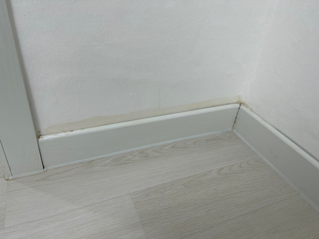 혹시 하부 걸레받이도 뜯었다가 다시 붙이신걸까요? 색깔로 보면 걸레받이부분을 뗐다가 재설치할 때 붙인 접착제가 벽치로 스며들어 퍼지면서 변색이 발생한 것 같기도 하네요. 사진만으로 판단하기에 좀 애매한 부분이 있네요.