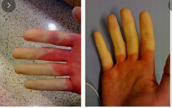 raynaud syndrome이 심하면 아래 사진과같이 되는데 가벼운 경우라서 이렇게까지 색변화가 없는 경우인지 확인이 필요하겠습니다.