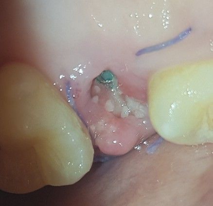 신경치료 후 크라운 씌웠던 치아에 염증이 생겨 발치하고 뼈이식 후 당일 나사 식립까지 마쳤습니다.
