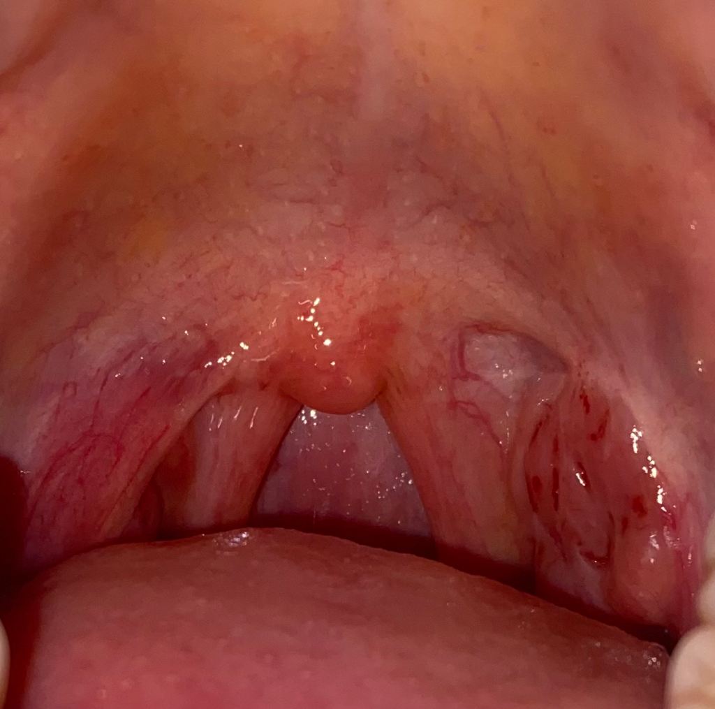 왼쪽(사진으로 봤을 때 오른쪽이지요) 편도가 약간 부어 있네요. 편도염 같아요. 소염 진통제를 드시구요. 지금이라고 금연하세요. 빨리 늙어요.