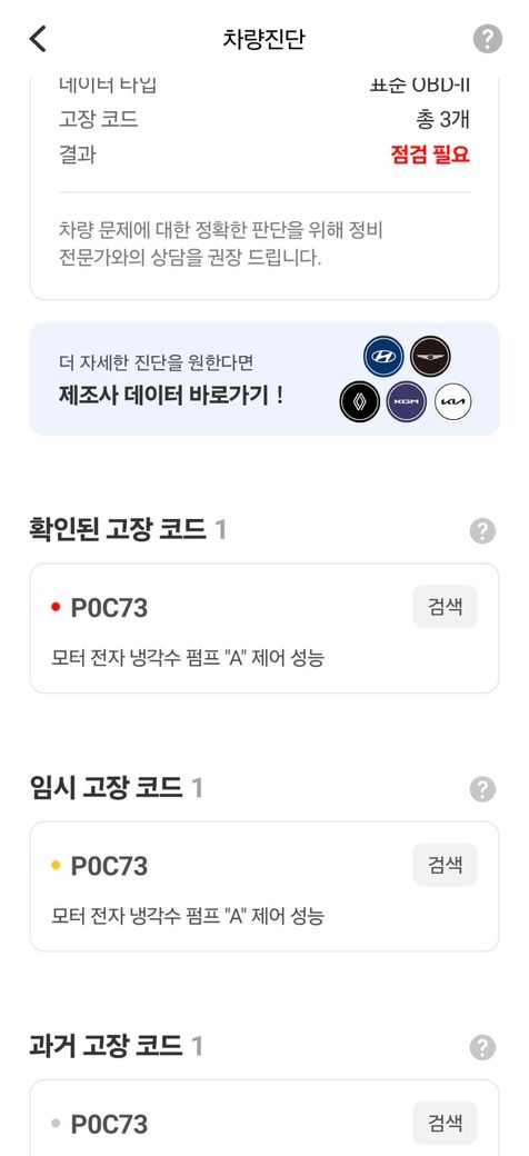 그래서 급한대로 인포카 찍어 보니깐 고장 저렇게 나와서 알아보니 냉각수 펌프에 문제 인거 같다고 하네요.