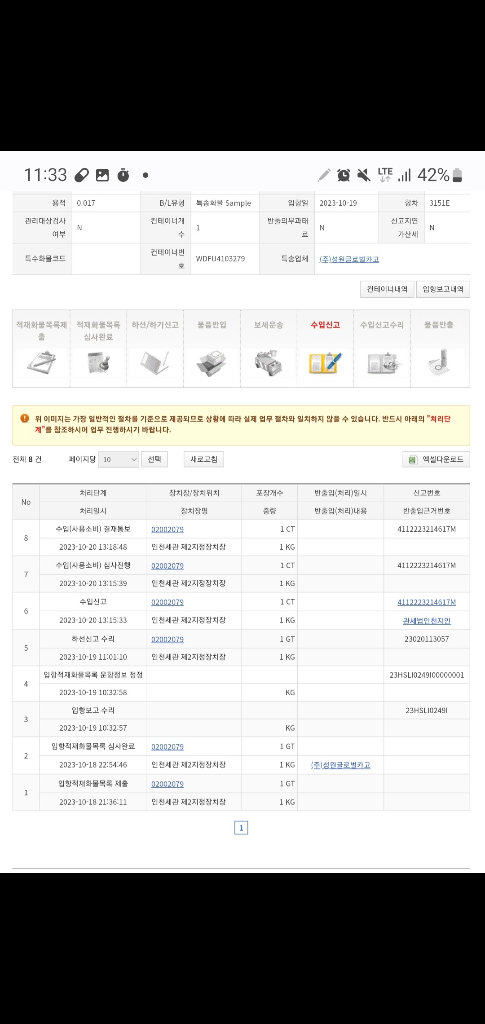 물품은 10월19일 국내에 들어와 10월20일 수입결재통보가 됐는데 아직 그상태로 멈춰있는 상태입니다.