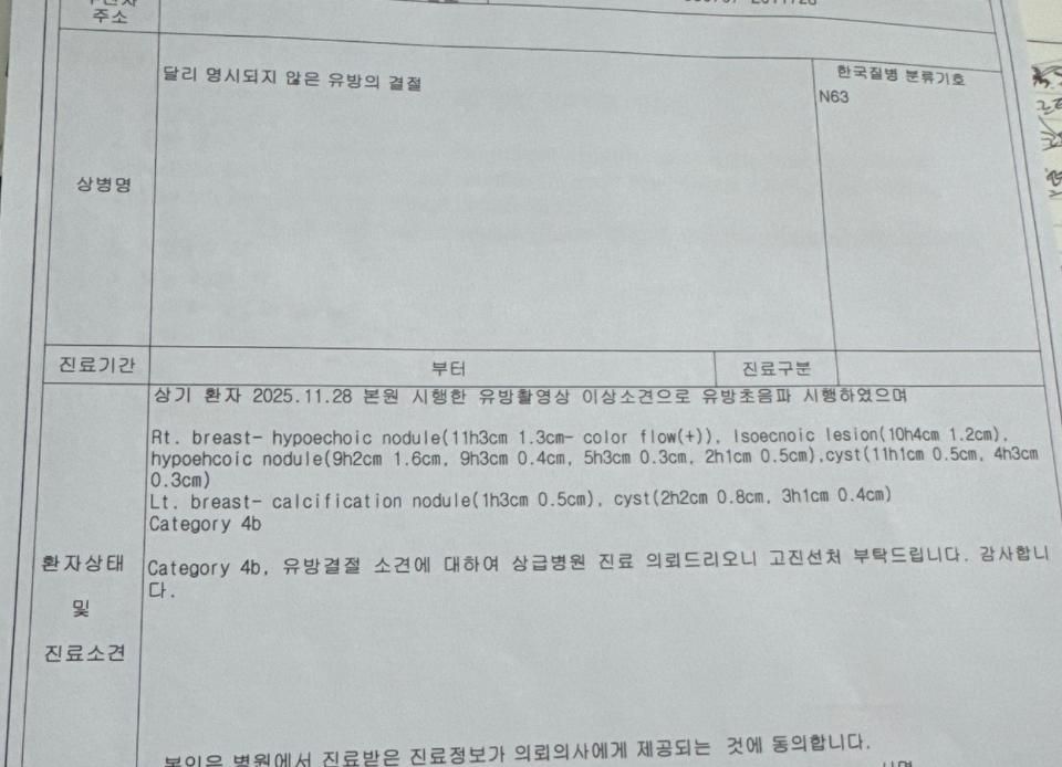 유방엑스레이 및 유방초음파 검사를 하셨으며 이상 소견으로 상급병원에 진료 의뢰되었군요
