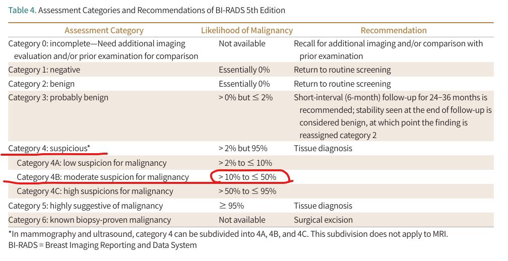 위에 갭처한 표에서 환자분이 해당하는 category 4b에 빨강색으로 표시를 하였습니다. category 4의 경우는 악성병변의 가능성이 있으며 조직검사가 필요합니다. 그리고 4b의 경우는 악성가능성이 10%~50%정도라고 고려하시면 됩니다.