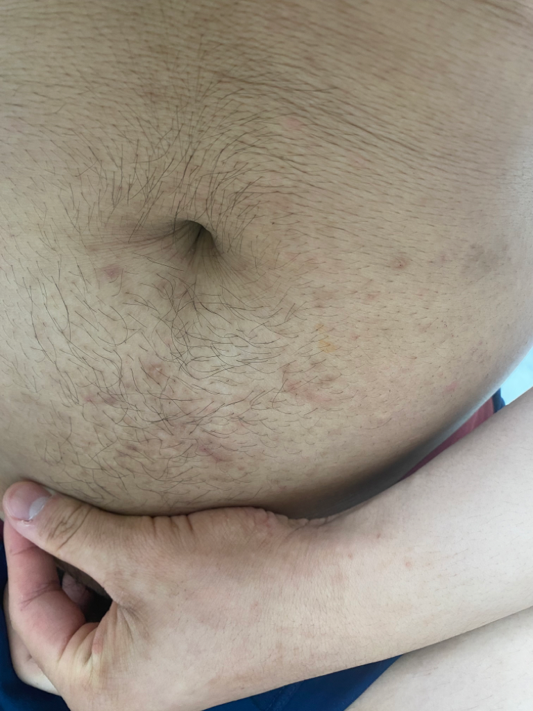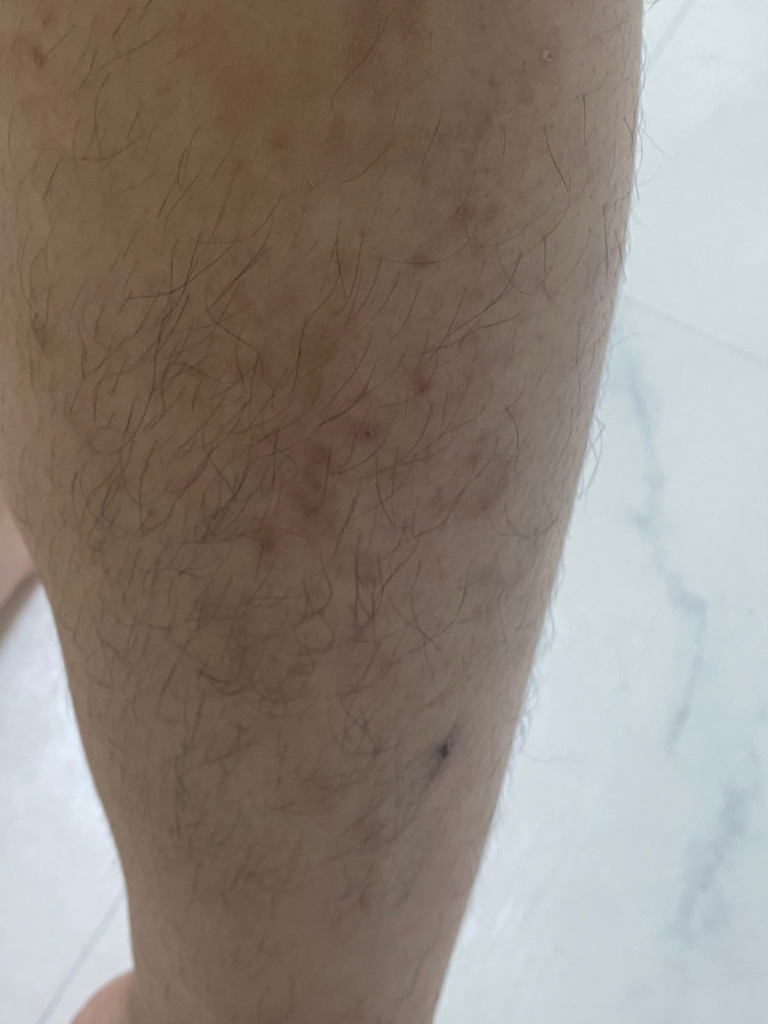 사진이 흐려서 잘 보이지는 않습니다. 전반적으로 모낭염이 있는 것 같지만 모낭염이 그렇게 가렵지는 않아서 가려움으로 피부를 긁어서 모낭염이 생긴 것 아닐가 싶습니다. 일단 모낭염은 항생제 연고를 써보고, 가려움 자체에 대해서는 평소 보습제를 자주 바르고, 항히스타민제를 드시는 것이 좋을 것 같습니다.