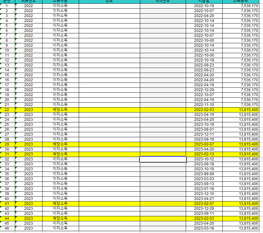 2022년~2023년 이자배댱지급명세서를 받았습니다.