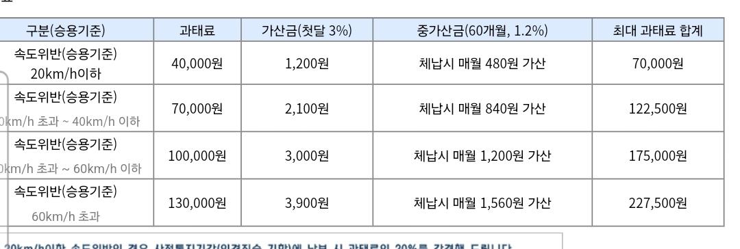 1. 과속 20km/h 이하: 과태료 4만 원 (승용차 기준)