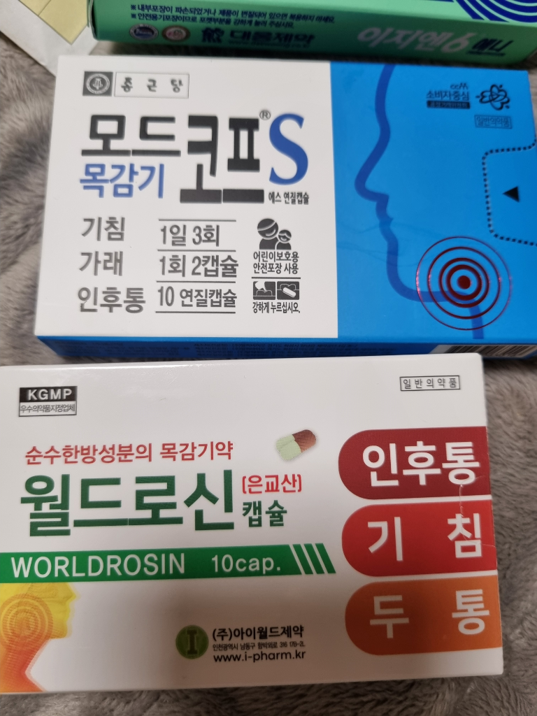 따라서 월드로신캡슐만 추가로 복용하는 것을 권장드리며 발열과 몸살기가 심하다면 모드코프는 한 알만 추가하는 것을 권장드립니다.