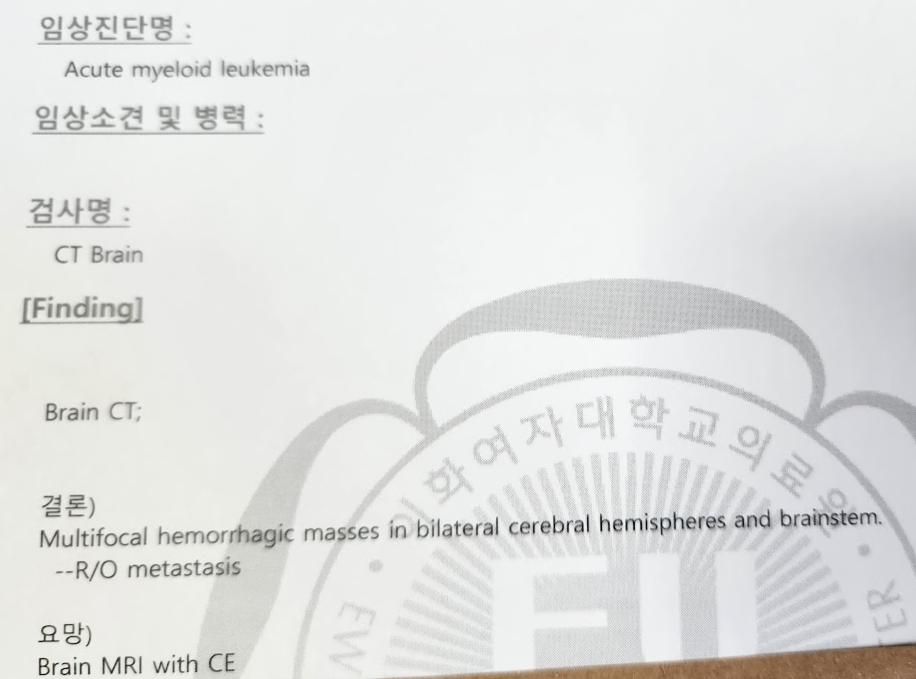 전화 통화를 해보니 백혈병으로 인한 뇌출혈인지 자발성? 뇌출혈인지 판단해야한다면서