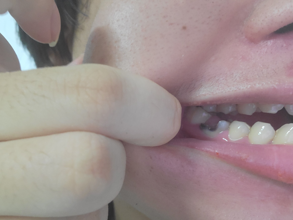 사진으로 정확한 판단이 어렵지만 뿌리까지 충치가 있을 가능성이 높으며 보존적인 치료는 불가능할 것으로 보입니다. 즉 해당 치아를 발치를 하고 임플란트나 브릿지 등의 시술을 고려해야 할 것으로 보입니다. 더 큰 질환으로 이어지기 전에 가까운 시일내로 치과를 방문하여 상담을 받아보시는 것을 추천드립니다.