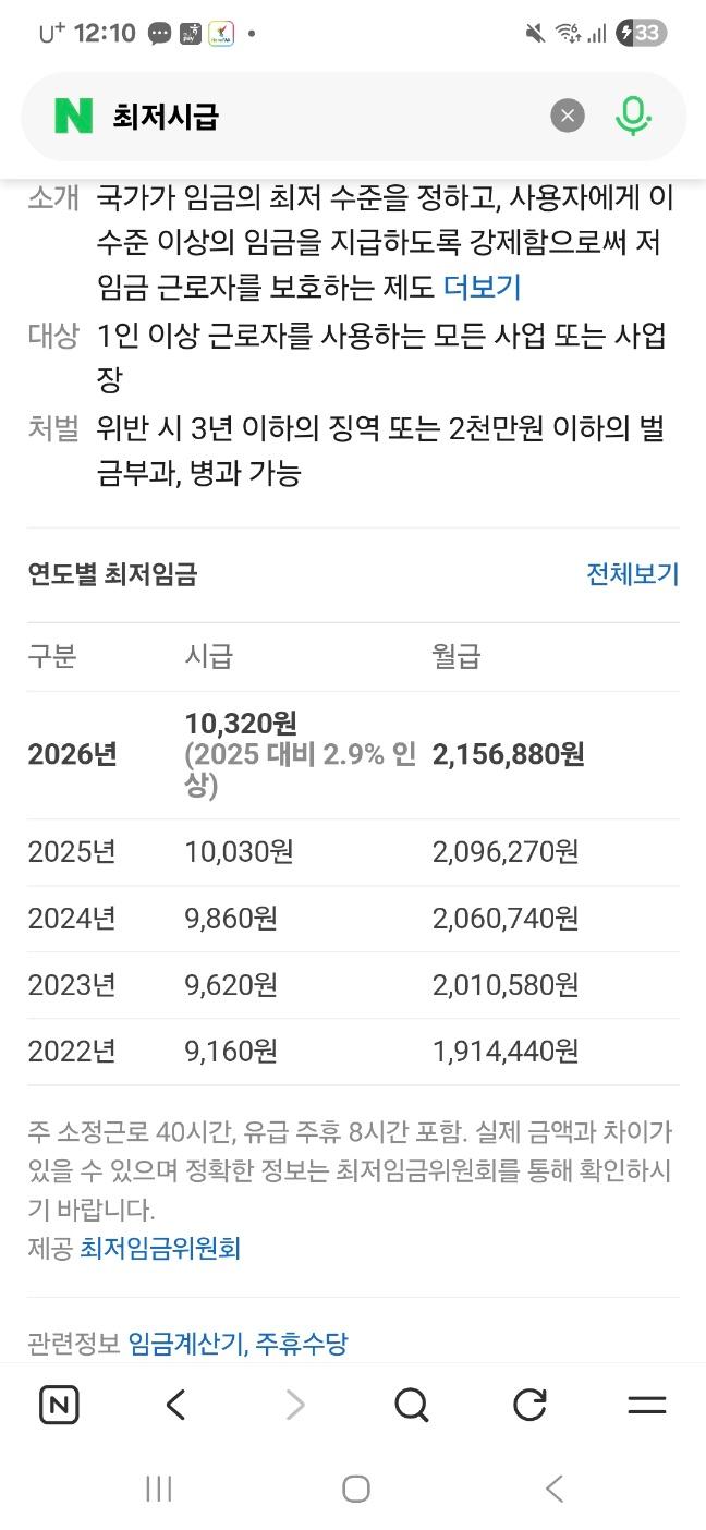 1일 8시간 + 주 5일 근로하는 경우 2026년 최저시급 10,320원 기준 최저 기본급은 2,156,880원입니다.