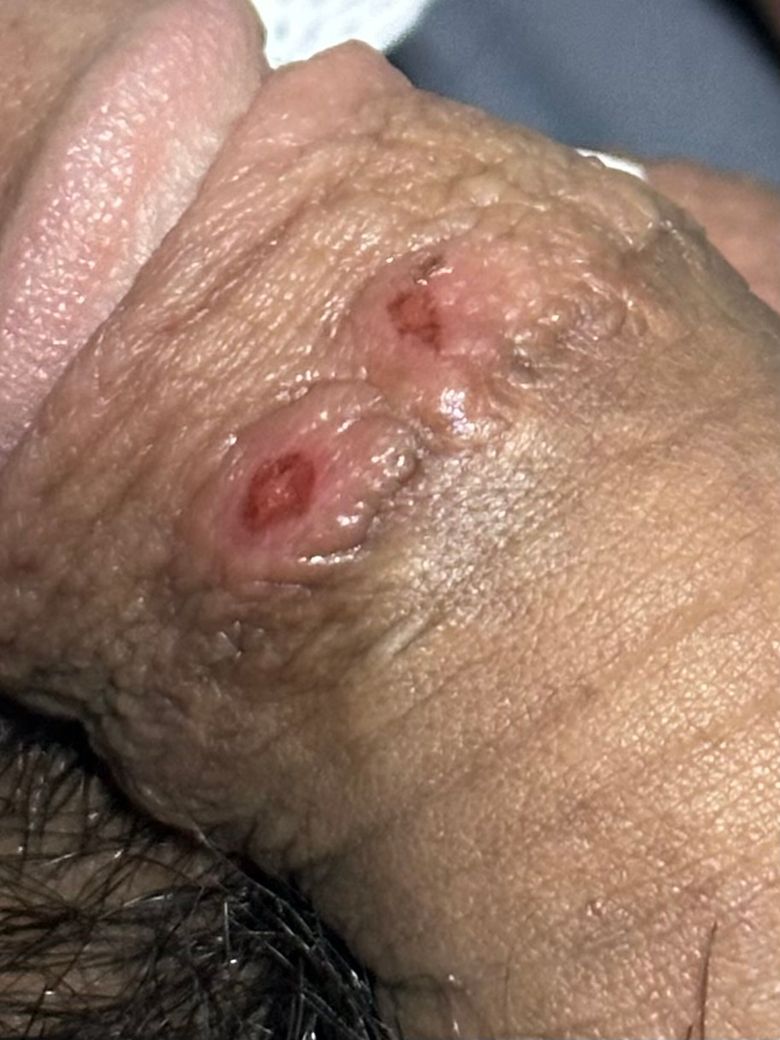 병변만으로 추정이 어려우나 헤르페스 또는 위험한 성 접촉이 있었다면 매독의 가능성도 생각되므로 비뇨기과 진찰을 받기 바랍니다.