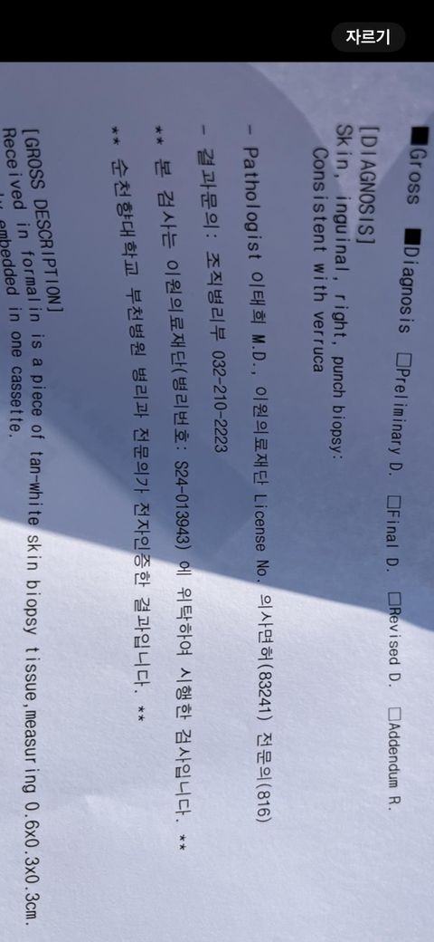 사타구니에 사마귀가 넓게 퍼져서 해당 병변 조직검사 시행하였고 결과지를 받았는데 의사분께서 좀 대충 말을 해주셔서 이 결과지 내용이 곤지름인지 아니면 일반 사마귀인지 궁금합니다