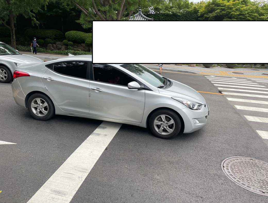 신호가 있는 행단보도가 녹색 신호로 변경되어 건너가고자 했으나 차가 사진보다 더 나와 있는 상태라(증거는 없음, 주변 카메라 없음, 상대차는 블랙 박스 전면부만 존재) 진로방해라고 제가 느껴 차 뒤로, 행단보도보다 몇 미터 밖인 차도 흰색 경계선 뒤로 걷던 중 차가 후진을 결정하여 차의 오른쪽 후미에 측면으로 저는 손목을 부딪쳤고, 조금 뒤로 밀려나는 충격이 있었습니다.