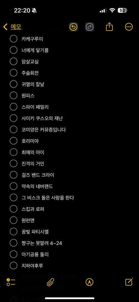 24년 12월 말쯤?부터 하이큐로 시작해서 새벽에 나히아 극장판까지 다 본 상태이고 체크 안 되어있는 것들은 천천히 볼 예정입니다. 지금은 방금 전에 보기 시작해서 주술회전 3화 보고 있습니다. 여기 있는 거 말고도 재밌는 애니 있으면 추천해주세요. 웬만하면 넷플이랑 티빙에 있는 애니로 부탁드립니다. 작화 중요시하게 봐요… OST도 좋은 거 있음 추천 부탁드립니당.. 나히아 오프닝은 다 좋아하구요 제 취향 제이팝 플리입니다 비슷한 노래 또는 ost 추천 부탁드릴게요..🙈🙏