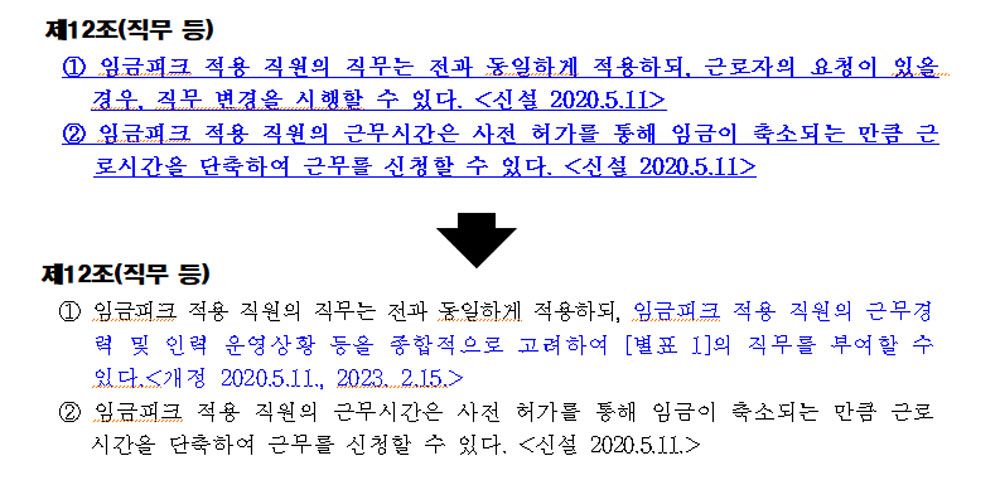 개정하면서 "근로자의 요청"부분을 삭제하여 사측의 결정에 따라 별표 1의 직무를 부여할 수 있도록 하였습니다.