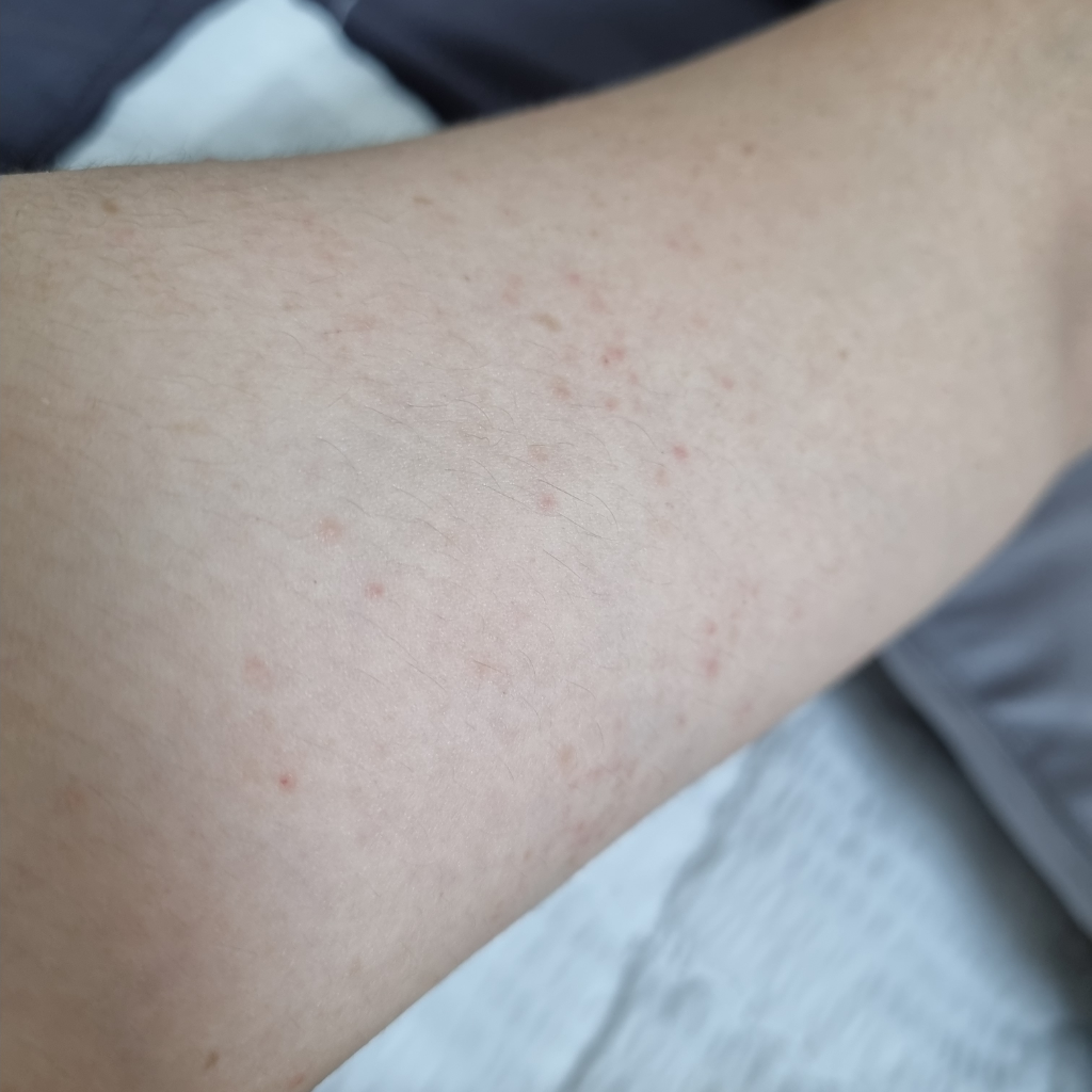 사진의 소견을 통해 보았을 때에는 땀띠처럼 생겼습니다. 땀띠가 발생하였을 때에는 환부가 습하지 않도록 관리를 해주면서 쾌적한 상태를 유지해주면 특별한 치료가 없이도 스스로 호전이 됩니다. 칼라민 로션 같이 진정 효과가 있는 제품들을 사용하는 것이 피부를 진정시키고 회복에 도움을 주긴 하지만 필수적인 것이 아니며 일상 생활에서 잘 관리해주는 것만으로도 금방 좋아집니다.