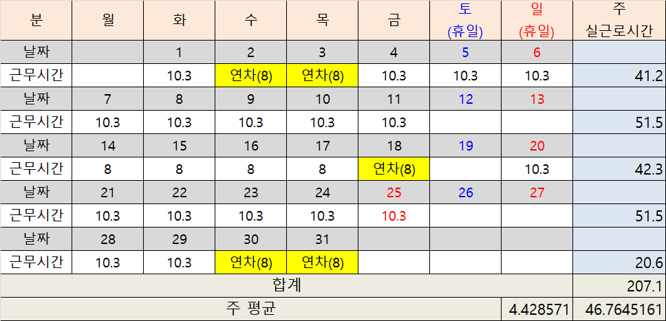 1. 연차휴가를 사용할 경우, 연차휴가를 제외한 월 실근무시간이 총 207시간이면, 주 평균 46.76시간 근무로 법에 위반되지 않는다.