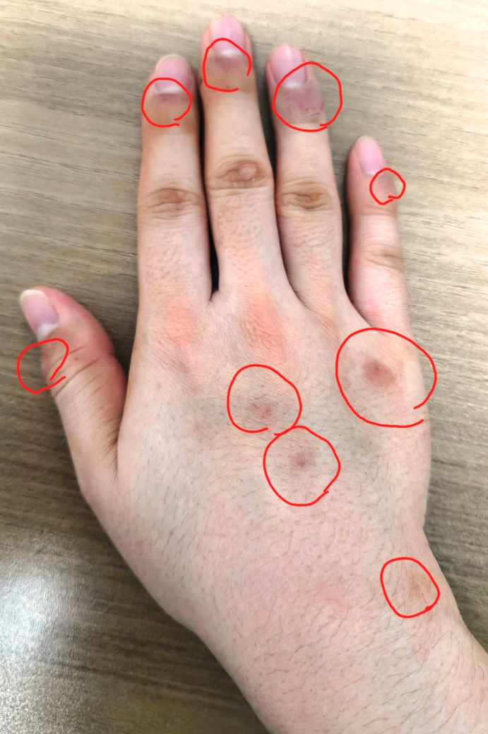 오른손 손등 부위 가려움과 발진증상과