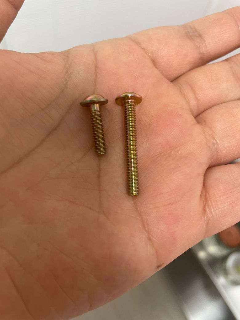 철 둥근머리십자볼트라고 검색해보시는 거 추천드립니다. 사이즈는 사진으로 예측이 어렵지만 M5 정도 될 거 같은데 일단 볼트 종류는 철 둥근머리십자볼트인 거 같습니다. 볼트 전문점에 연락해보시는 거 좋을 거 같습니다.
