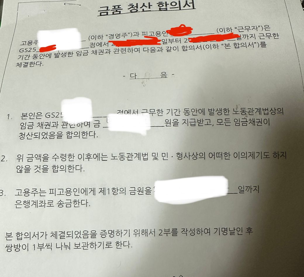 상기 금품청산 합의서 제1항에 따라 해당 사업주와의 근로관계에 있어 해당 합의금을 지급하기로 함에 따라 모든 임금채권이 청산되었기에 추후에 미지급된 주휴수당 등을 청구할 수 없습니다.